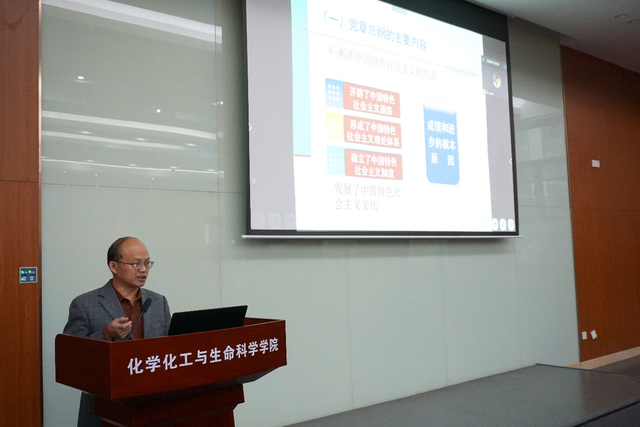 陈教授以“党章里的荣光”为题,从党章是立党治党管党的总章程总规矩、党章(一大至十九大党章)是党的光辉历史的见证、学习党章应着重把握的重要内容和学习党章是全体党员的基本功和必修课四方面展开学习了党章。党章回答了入党“为什么”这一首要问题,回答了党员标准“是什么”这一核心问题,回答了入党以后“怎么做”这一关键问题,因而要做合格党员,学习贯彻党章都是第一位的要求。陈教授强调,学习党章是非常严肃的,不仅要学习党章,更要把党章融会贯通,做到学而懂、学而信、学而用。随着陈教授抑扬顿挫、深入浅出的讲解,大家增进了对党章的了解与认识,更加深刻认识到党章的严肃性,更加深刻认识到学习党章的重要性,更加明白应以党章为指导,做一名合格党员。