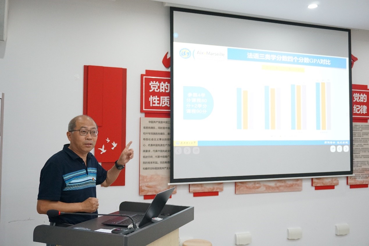袁国华副院长专题党课结合个人专业背景、涉外管理经历、主题教育学习体会以及近期牵头调研结果,从“六个坚持”世界观和方法论、牢固树立战略思维、成人在线 发展面临的“六大困境”以及成人在线 特色突破点等四个方面展开。他认为,通过主题教育,我们应该准确把握“六个坚持”的辩证逻辑,把师生满意不满意作为决策的根本判断标准,把切实解决师生急难愁盼问题作为一切工作的出发点和落脚点,以舍我其谁的责任感抓紧解决如何整体提升成人在线 学生GPA等紧迫问题;要善于从战略管理视角,正确运用SWOT工具分析成人在线 高质量发展所面临外部机遇与挑战和内部优劣势,通过调研真找问题、找真问题;要对标对表中外合作办学机构评估和本科教育教学审核评估指标体系,清醒认识成人在线 当前和未来面临的各类困境,把前期通过调研归集的“问题清单”“任务清单”“责任清单”转化为推动高质量通过初次评估的“成效清单”;要主动担责,善作善成,把法语学习过程性评价、翻转式线上线下融合教学、“六航工程”与“五育并举”一体推进等马赛特色工作落地、落实、落细。