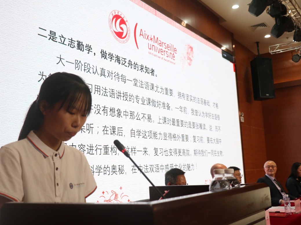 成人在线 本科2019级学生王子依作为学生代表,用流利的法语向现场的同学们介绍了一年来的学习和生活感悟,她呼吁马赛学子把握机遇,真正成为生物医药领域熟悉中西方文化,具有国际视野、创新精神和卓越能力的国际化创新人才,成为中法友谊及文化交流的传播者和代言人!
