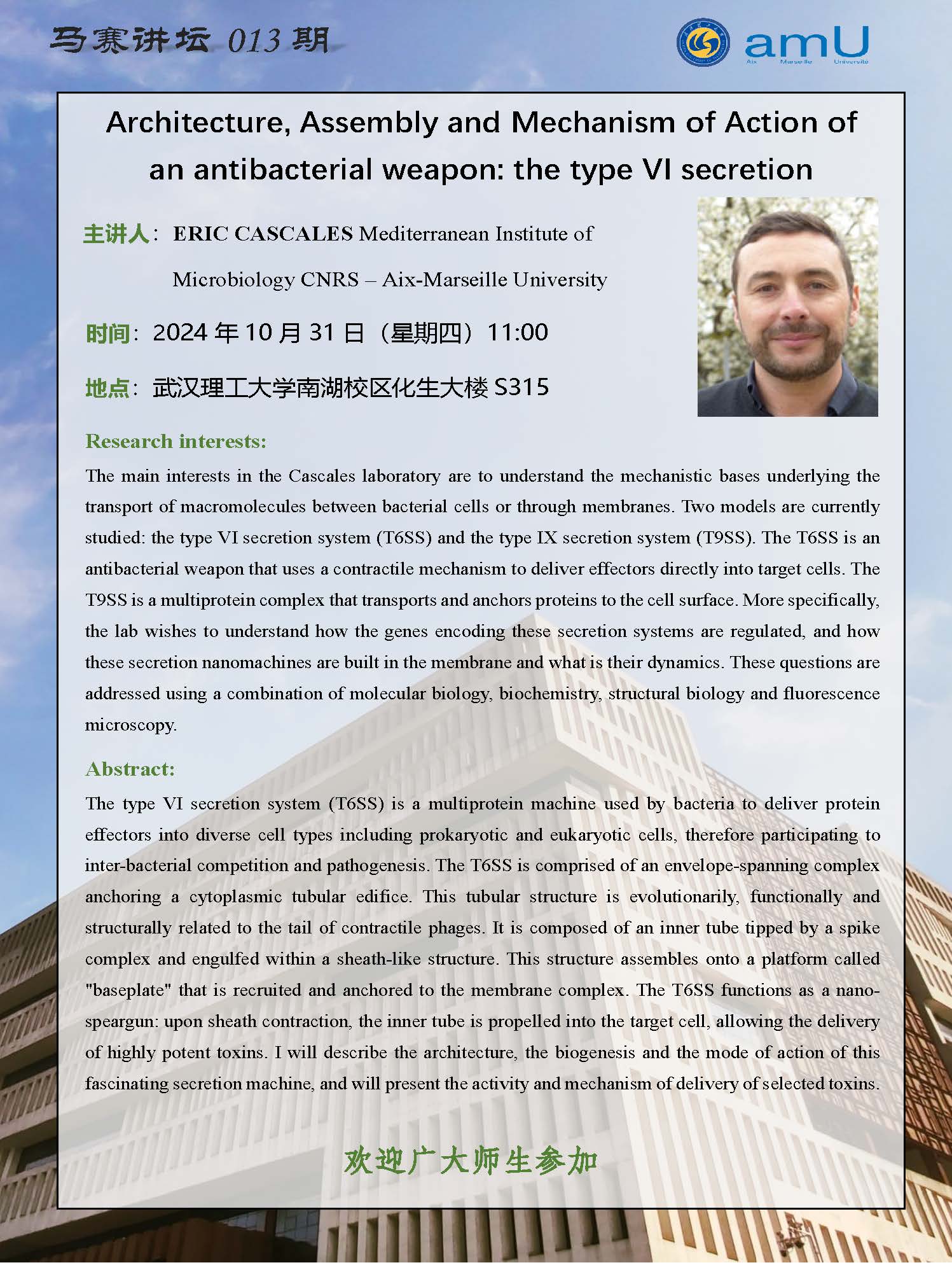 【马赛讲坛013期】Architecture, Assembly and Mechanism of Action of an antibacterial weapon: the type VI secretion