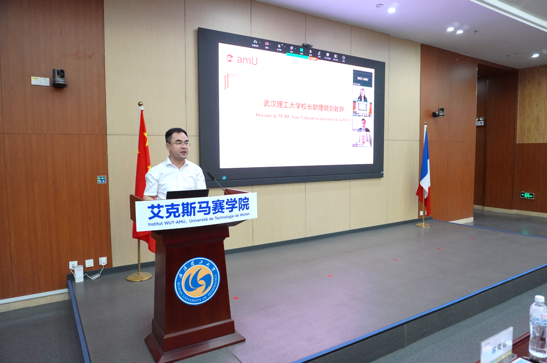 校长助理胡剑向2024级本科生及成人在线新生们表示热烈的欢迎,此次开学典礼不仅标志着新生大学生活的开始,也展现了学校对教育对外开放的坚定承诺和积极贡献。对新生的成长,他提出三点期望:感知时代、学会适应;敢迎困难、不惧挑战;求知求真、勇于创新,努力成为中法文化交流的使者,增进两国友谊。